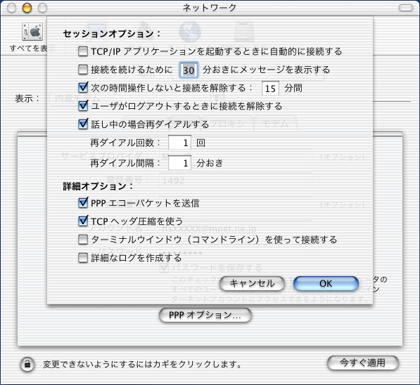 | 4.『PPPオプション』の設定は、初期値のままで問題ありません。 自動接続を行いたい場合は『TCP/IPアプリケーションを起動するときに自動接続する』にチェックを入れます。 設定が終わったらこのオプション画面は『OK』で閉じます。 | ||||||||||||||||