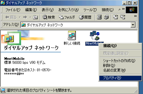 | 6.『ダイヤルアップネットワーク』の画面に戻りましたら、新しくできた設定アイコンを右クリックし『プロパティ』を開きます。 |